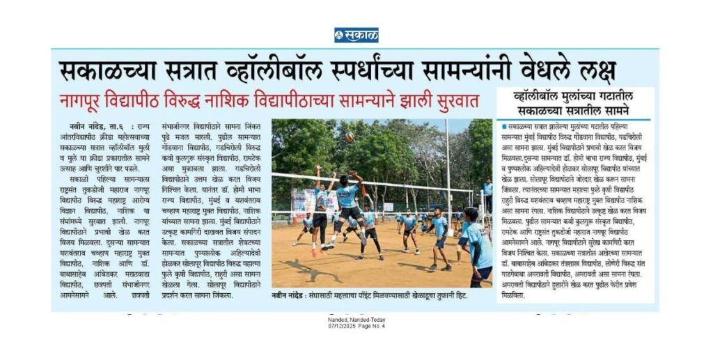 क्रीडा महोत्सव २०२५: सकाळच्या सत्रात व्हॉलीबॉल स्पर्धांचे रोमांचक सामने स्वामी रामानंद तीर्थ मराठवाडा विद्यापीठ, नांदेड येथे सुरू असलेल्या २७ व्या महाराष्ट्र राज्य आंतरविद्यापीठ क्रीडा महोत्सव २०२५च्या सकाळच्या सत्रात व्हॉलीबॉल मुली व मुले या क्रीडा प्रकारातील सामने उत्साह आणि चुरशीने पार पडले. व्हॉलीबॉल मुलींच्या गटातील सकाळच्या सत्रात पहिल्या सामन्याला राष्ट्रसंत तुकडोजी महाराज नागपूर विद्यापीठ, नागपूर विरुद्ध महाराष्ट्र आरोग्य विज्ञान विद्यापीठ, नाशिक या संघांमध्ये सुरुवात झाली. नागपूर विद्यापीठाने प्रभावी खेळ करत विजय मिळवला. दुसऱ्या सामन्यात यशवंतराव चव्हाण महाराष्ट्र मुक्त विद्यापीठ, नाशिक आणि डॉ. बाबासाहेब आंबेडकर मराठवाडा विद्यापीठ, छत्रपती संभाजीनगर आमनेसामने आले. छत्रपती संभाजीनगर विद्यापीठाने सामना जिंकत पुढे मजल मारली. पुढील सामन्यात गोंडवाना विद्यापीठ, गडचिरोली विरुद्ध कवी कुलगुरू संस्कृत विद्यापीठ, रामटेक असा मुकाबला झाला. गडचिरोली विद्यापीठाने उत्तम खेळ करत विजय निश्चित केला. यानंतर डॉ. होमी भाभा राज्य विद्यापीठ, मुंबई व यशवंतराव चव्हाण महाराष्ट्र मुक्त विद्यापीठ, नाशिक यांच्यात सामना झाला. डॉ. होमी भाभा मुंबई विद्यापीठाने उत्कृष्ट कामगिरी दाखवत विजय संपादन केला. सकाळच्या सत्रातील शेवटच्या सामन्यात पुण्यश्लोक अहिल्यादेवी होळकर सोलापूर विद्यापीठ विरुद्ध महात्मा फुले कृषी विद्यापीठ, राहुरी असा सामना खेळला गेला. सोलापूर विद्यापीठाने दमदार प्रदर्शन करत सामना जिंकला. व्हॉलीबॉल मुलांच्या गटातील सकाळच्या सत्रात झालेल्या पहिल्या सामन्यात मुंबई विद्यापीठ, मुंबई विरुद्ध गोंडवाना विद्यापीठ, गडचिरोली असा सामना झाला. मुंबई विद्यापीठाने प्रभावी खेळ करत विजय मिळवला. दुसऱ्या सामन्यात डॉ. होमी भाभा राज्य विद्यापीठ, मुंबई व पुण्यश्लोक अहिल्यादेवी होळकर सोलापूर विद्यापीठ यांच्यात खेळ झाला. सोलापूर विद्यापीठाने जोरदार खेळ करून सामना जिंकला. त्यानंतरच्या सामन्यात महात्मा फुले कृषी विद्यापीठ, राहुरी विरुद्ध यशवंतराव चव्हाण महाराष्ट्र मुक्त विद्यापीठ, नाशिक असा सामना रंगला. नाशिक विद्यापीठाने उत्कृष्ट खेळ करत विजय मिळवला. पुढील सामन्यात कवी कुलगुरू संस्कृत विद्यापीठ, रामटेक आणि राष्ट्रसंत तुकडोजी महाराज नागपूर विद्यापीठ, नागपूर आमनेसामने आले. नागपूर विद्यापीठाने सुरेख कामगिरी करत विजय निश्चित केला. सकाळच्या सत्रातील अखेरच्या सामन्यात डॉ. बाबासाहेब आंबेडकर तंत्रशास्त्र विद्यापीठ, लोणेरे विरुद्ध संत गाडगेबाबा अमरावती विद्यापीठ, अमरावती असा सामना रंगला. अमरावती विद्यापीठाने हुशारीने खेळ करत पुढील फ